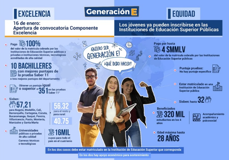1. **Beca Generación E:** Esta beca está dirigida a estudiantes de bajos recursos económicos y pertenecientes a los estratos 1, 2 o 3. Se otorga a través del Programa de Acceso, Permanencia y Graduación (PAPG) del Ministerio de Educación Nacional. La Beca Generación E cubre el valor total de la matrícula en instituciones de educación superior reconocidas por el Ministerio.